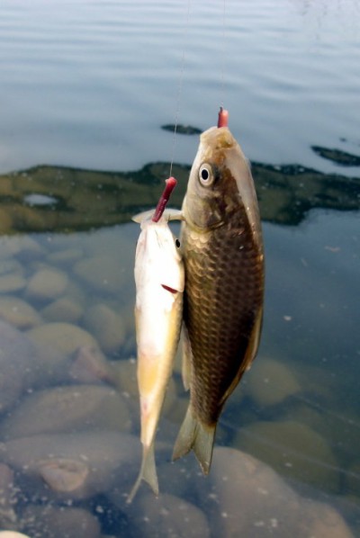 像鲫鱼、鲤鱼、草鱼、青鱼这类我们比较常见的“性情”温顺的鱼种,都是可以共同在同一片水域之中觅食的。即我们可以在野钓钓鲫鱼的时候也能钓到鲤鱼,野钓草鱼的时候也能钓到鲫鱼等种种组合。但在有相对凶猛的肉食性鱼种出没觅食时,则很难有“温顺”鱼种在附近游弋,即使是成群结队的小鱼,见到它们的出现也会疯狂的逃窜。所以说野钓选目标鱼也需要将这一类的鱼的生活习性考虑进去。