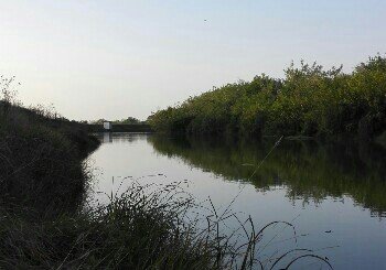 十里铺下高后右转,到高速公路桥前左转向北,那里有一农庄,水深超过2.5米,高速公路桥下更深。那里有一艘电打鱼的铁船。不定期电打一次。但水较深,小鱼总是打不完的。
